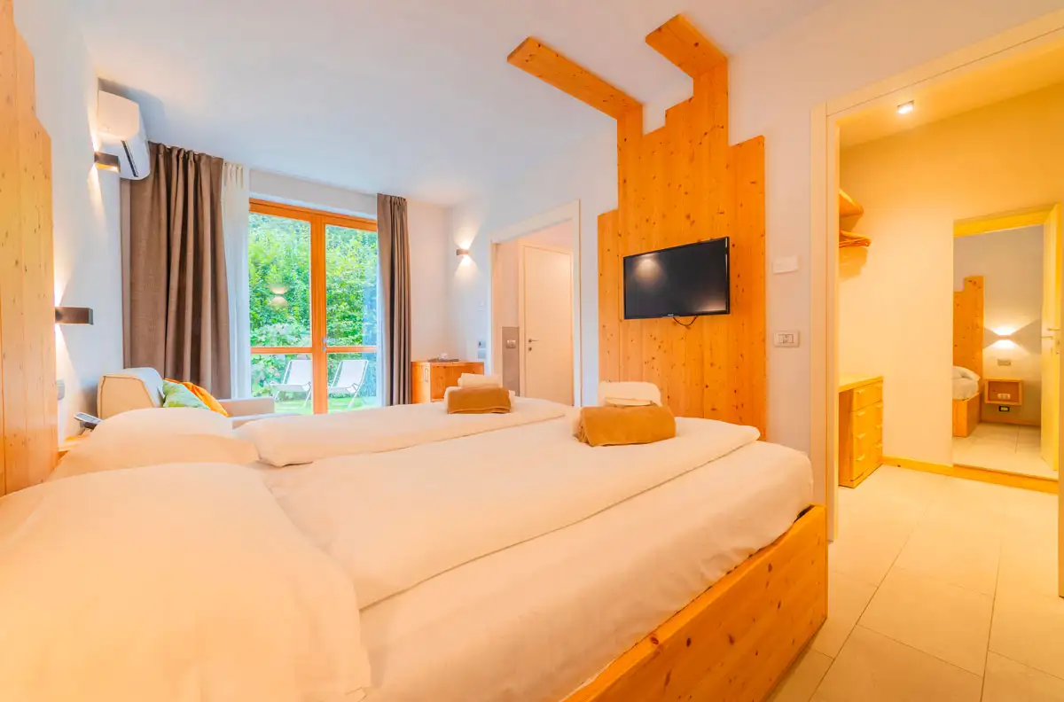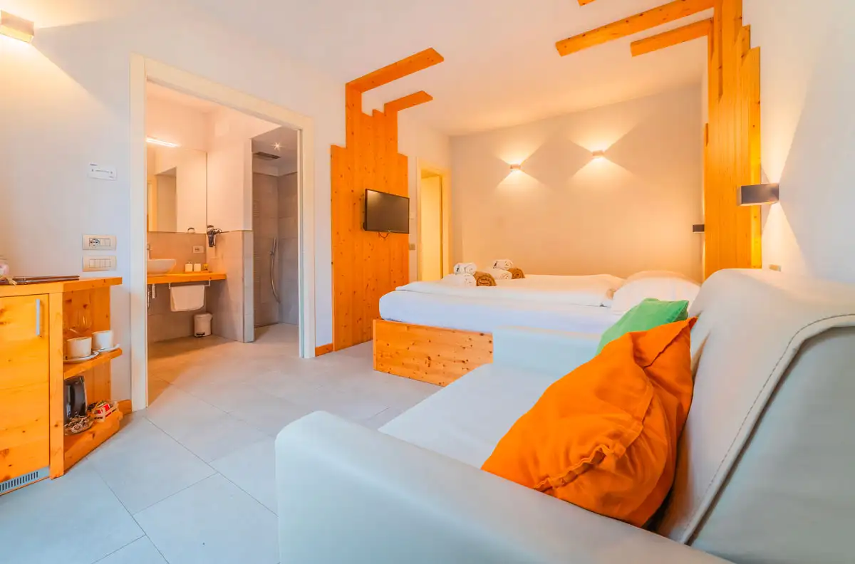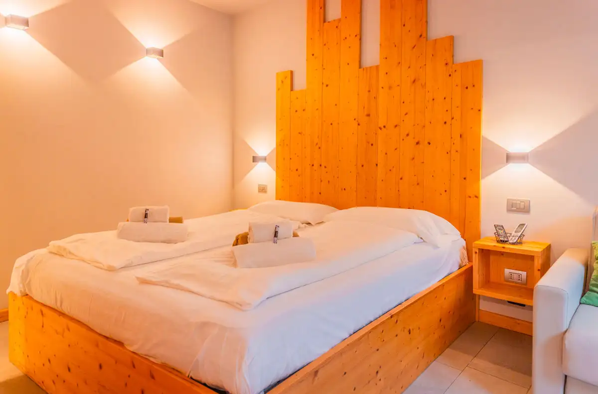 Per le famiglie con bambini è possibile aggiungere un lettino per i più piccoli, garantendo loro un sonno tranquillo e sicuro. In alternativa, la poltrona presente nella camera può trasformarsi in un nido accogliente, perfetto per accogliere i vostri bambini in un ambiente confortevole.