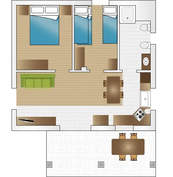 - 2 camere da letto, una con letto matrimoniale e una con letto a castello e letto singolo