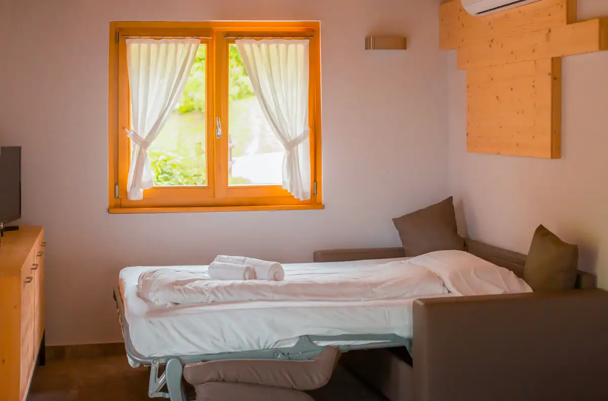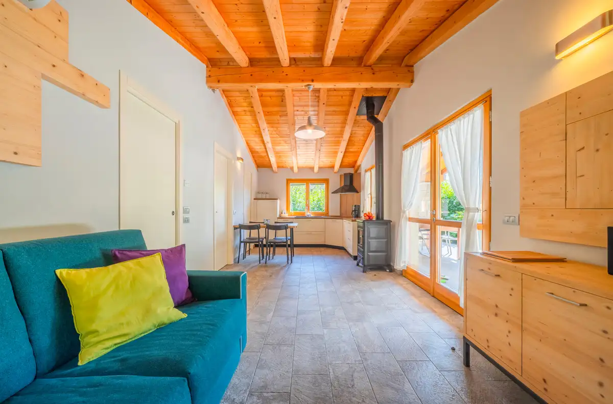 - Soggiorno con divano letto, TV, stereo, impianto di aria condizionata e stufa a legna
