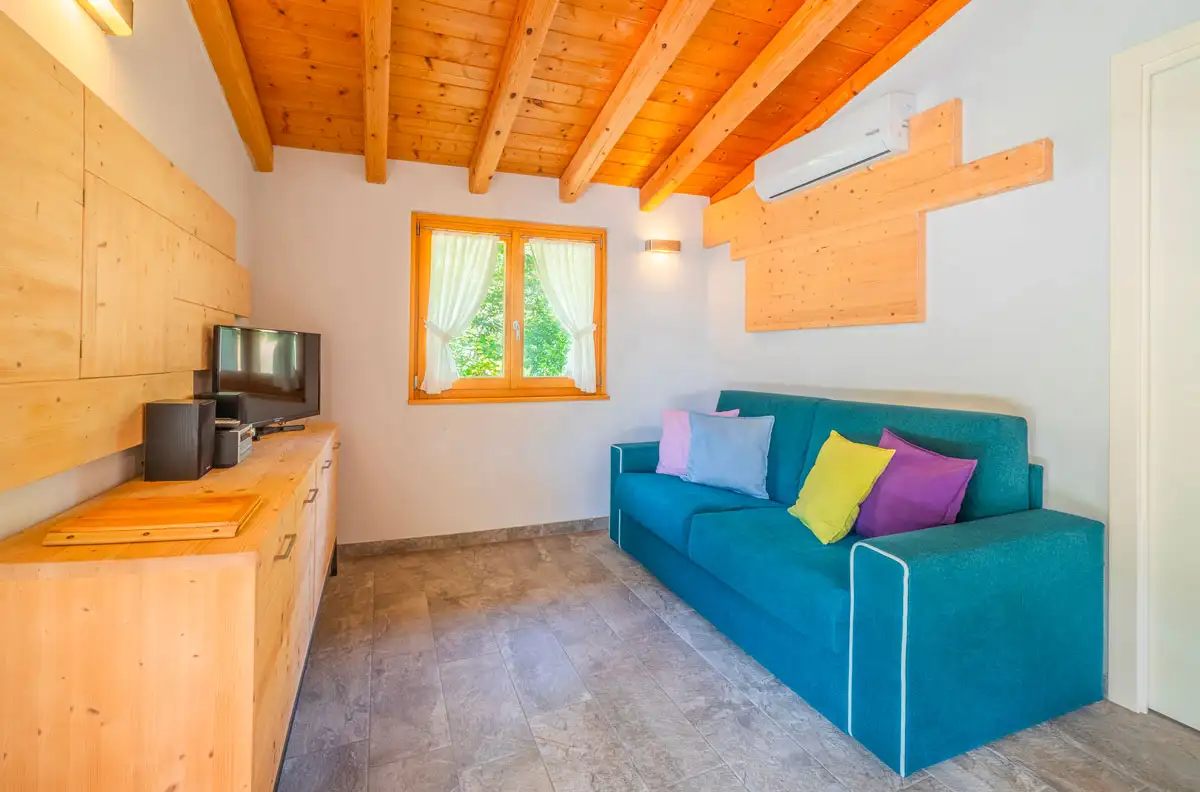 - Soggiorno con divano letto, TV, stereo, impianto di aria condizionata e stufa a legna